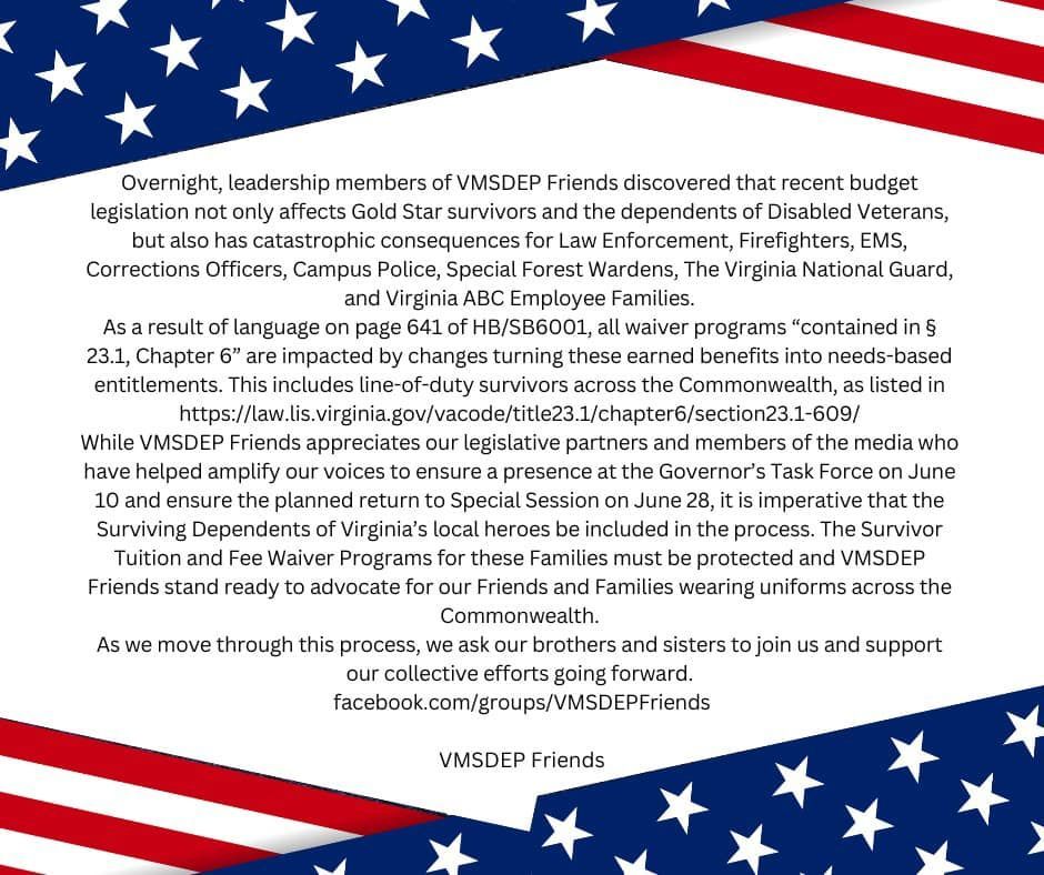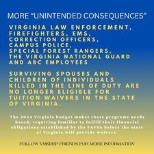 Call your legislators! Call the governor! Demand that VACOPS and other LE groups be included on the governor's task force to study VMSDEP (Virginia Military Survivors and Dependents Program)!